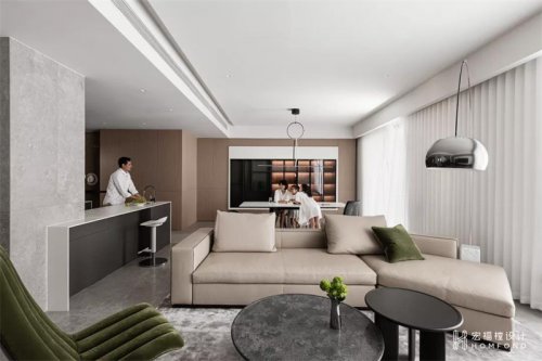整個(gè)空間以白色、灰色、墨綠(她喜愛的顏色)為主,藕粉、低飽和橙色作為點(diǎn)綴,采用無主燈設(shè)計(jì),幾何石膏造型吊頂。
