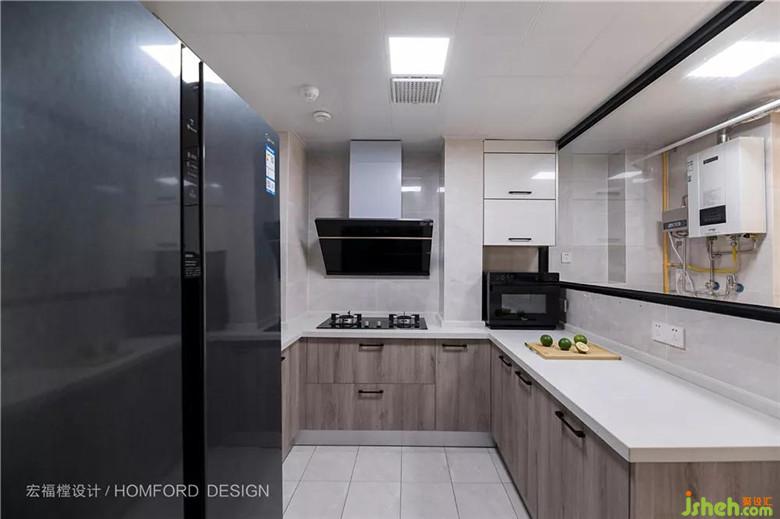 原廚房面積局促,裝修設(shè)計(jì)利用生活陽臺增大面積后寬敞舒適。滿足大型家電的擺放后,一家人同時在這里忙碌都不會顯得擁擠。