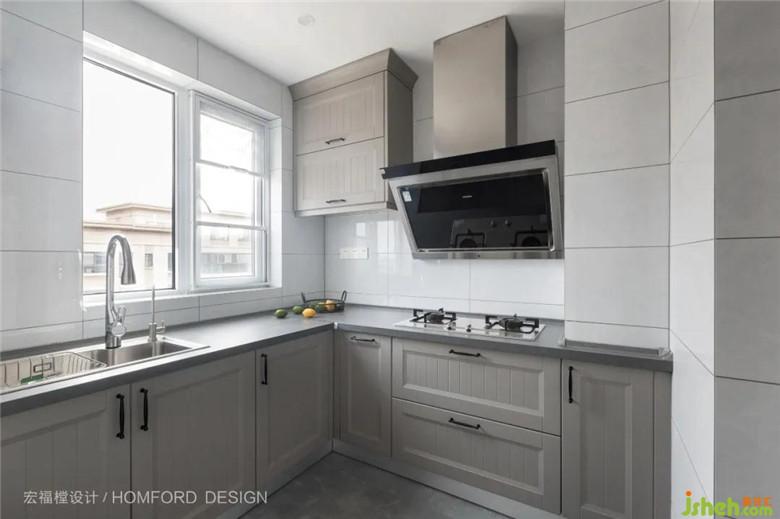 減少不必要的裝飾,外部陽(yáng)光進(jìn)入廚房后,經(jīng)過(guò)白色瓷磚反光效果,使得廚房空間更加敞亮。延續(xù)餐廳配色,以簡(jiǎn)單的實(shí)用性強(qiáng)調(diào)生活的本質(zhì),讓身處于此倍感舒適溫柔。