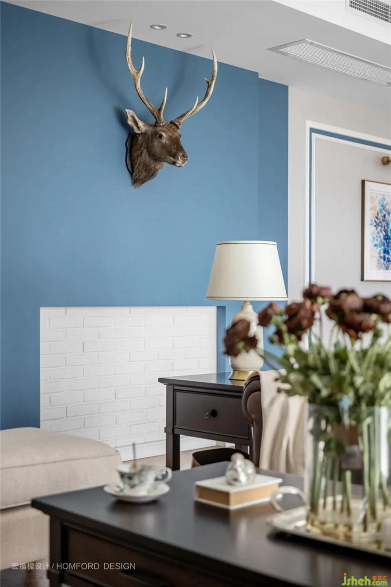 沙發(fā)通過同色系深淺不一的色調(diào)處理,鋼藍(lán)色為后退色、給人以空間整體向后延伸感,疊加文化石肌理,賦予空間一種動(dòng)態(tài)韻律和美感。