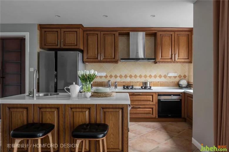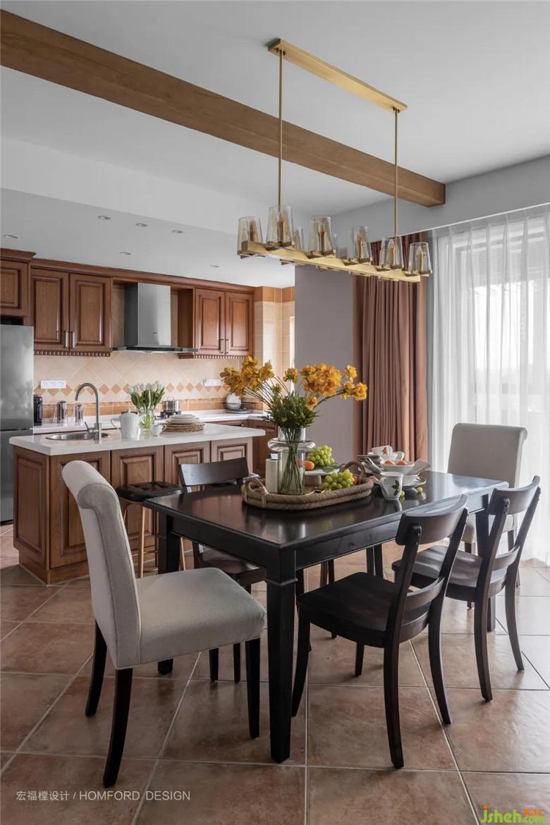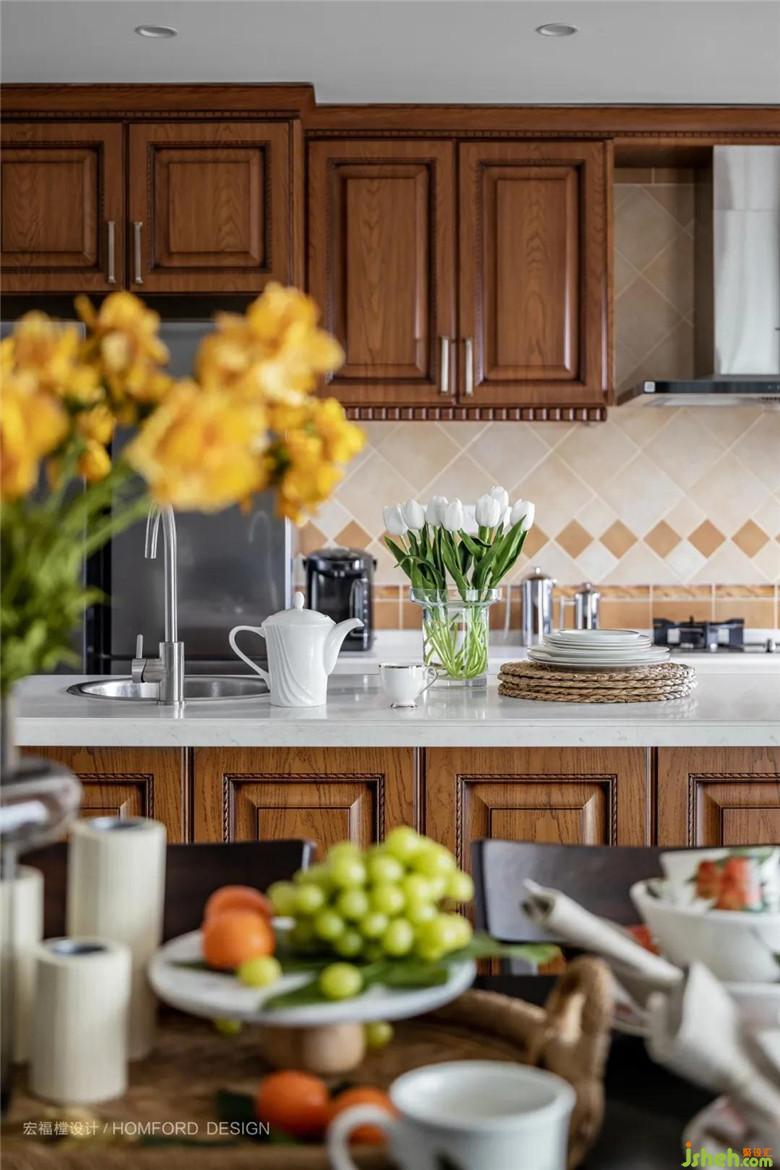 中島臺可以分解儲物功能,擴(kuò)大廚房進(jìn)深尺寸,整個開放區(qū)域的視覺感受得以最大程度的放大。寬敞明快的空間感,讓家人間的互動變得緊密,打破了現(xiàn)代居家生活方式無交流的窘境。