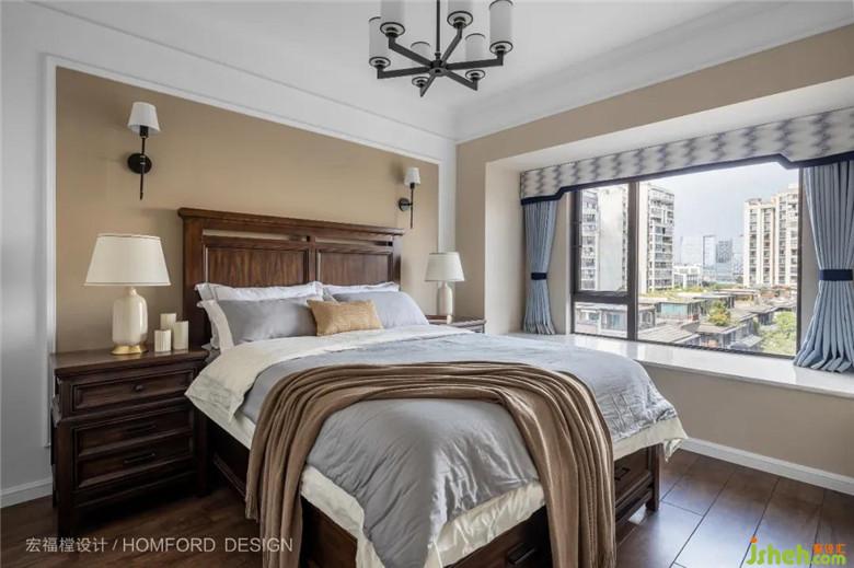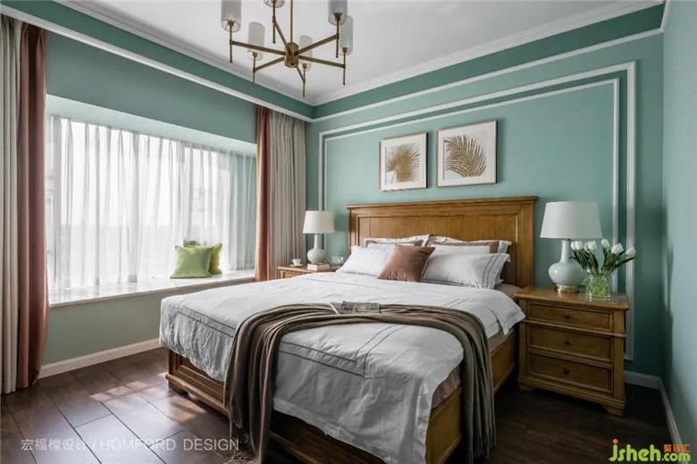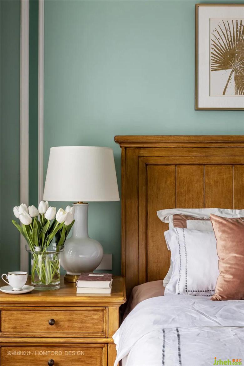 主臥以淺湖藍(lán)綠打底,低飽和度的色系非常耐看。搭配同色色系寶石綠、蜂蜜色家具以增加深空間層次,整體清爽干凈且能很好延續(xù)空間調(diào)性不經(jīng)意間展現(xiàn)出別樣的美式風(fēng)情。