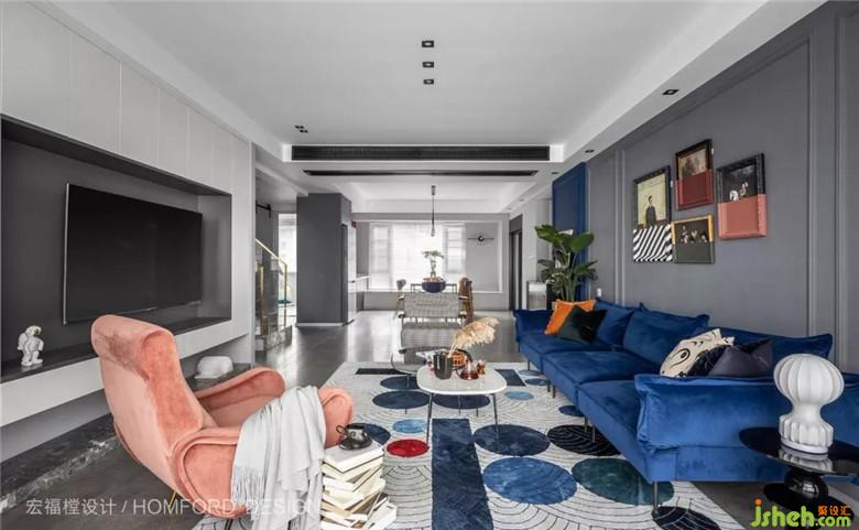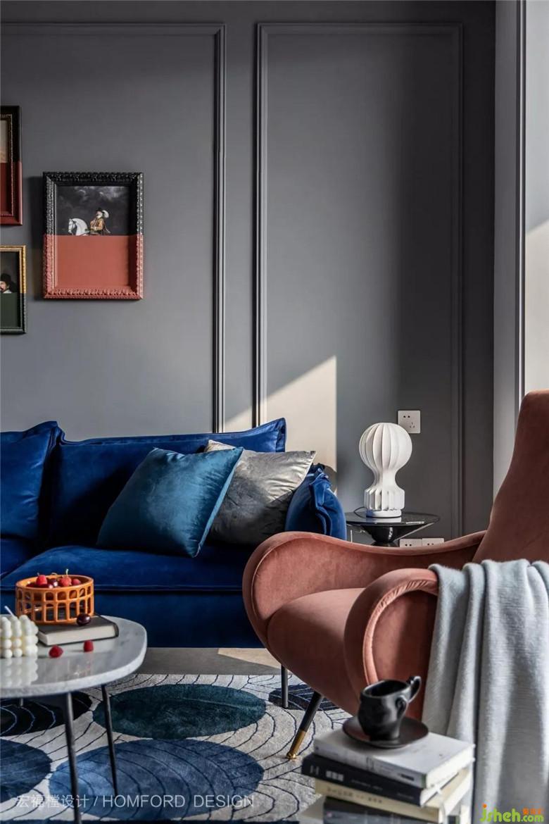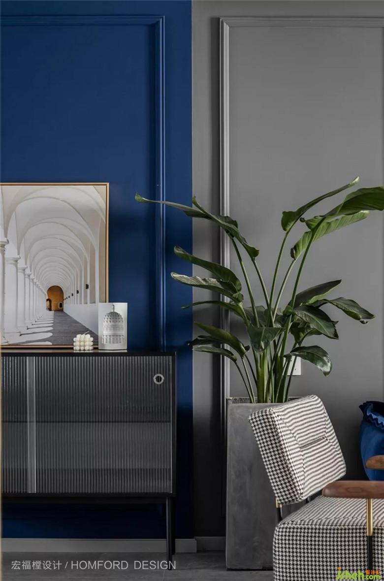 客廳主沙發(fā)的色塊摩洛哥藍(lán)是客戶非常喜歡的色彩、為了色彩的延續(xù)和呼應(yīng)。沙發(fā)背造型小尺度繼續(xù)沿用了摩洛哥藍(lán)、大面積以白鯨灰來(lái)做底色,更好的凸顯沙發(fā)的色質(zhì)。