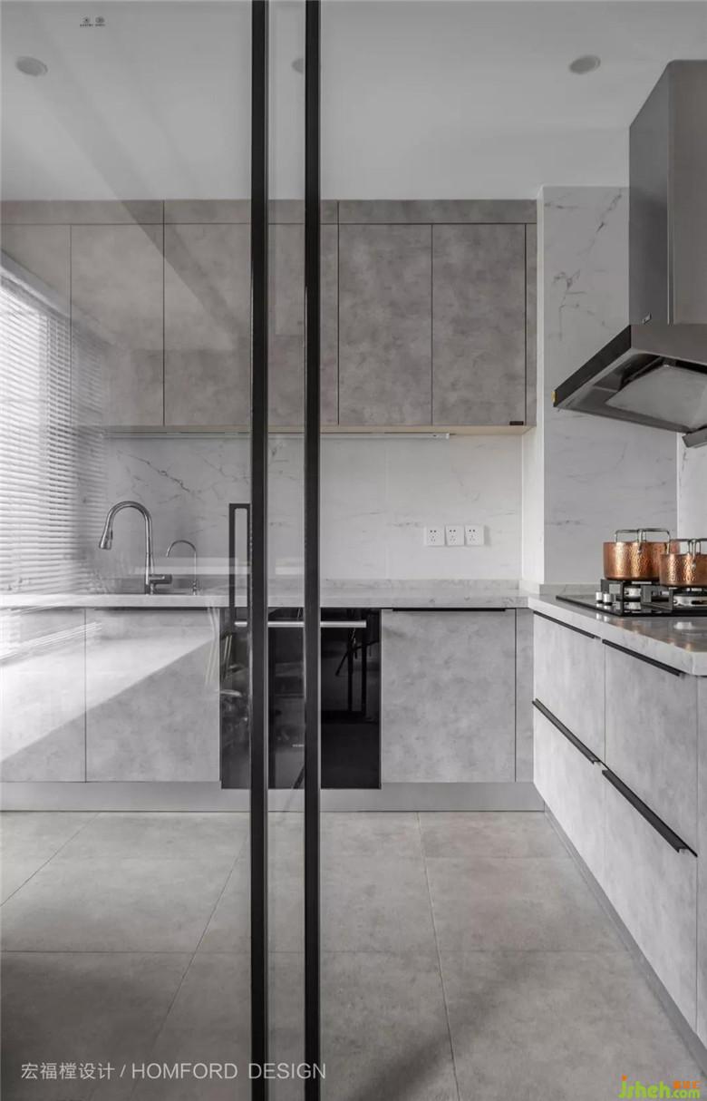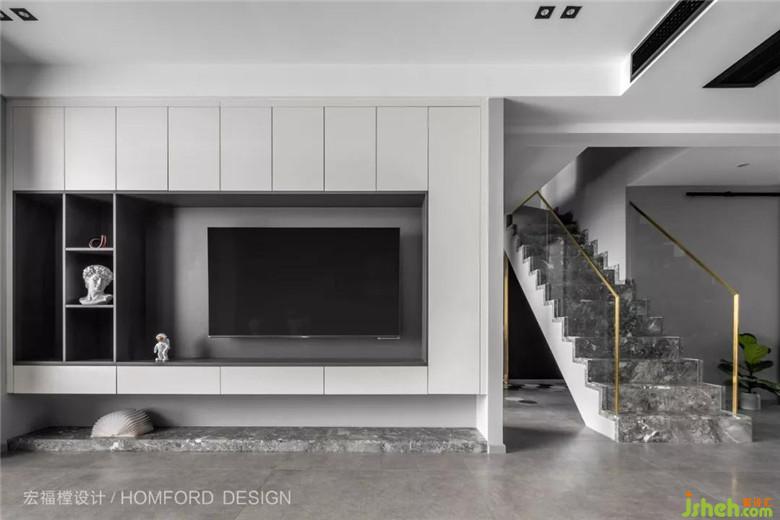 大面積的灰色面不加修飾的美,蘊(yùn)含著屋主對(duì)生活持有的美學(xué)態(tài)度,鏤空的開放展示架可以隨時(shí)添置或者更換他們喜愛的藝術(shù)品。