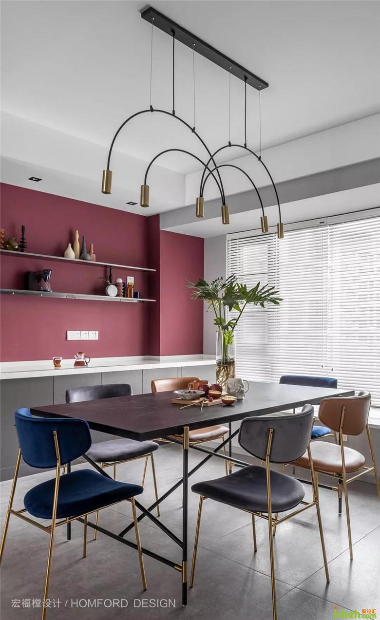 餐廳部分視野開闊、與客廳動(dòng)線緊密聯(lián)系、室內(nèi)設(shè)計(jì)師為了使兩個(gè)空間色彩不過于單調(diào)、西廚墻面選用了絳紅色對(duì)比。讓繁瑣的一日三餐顯得生動(dòng)俏皮,充滿煙火氣息。