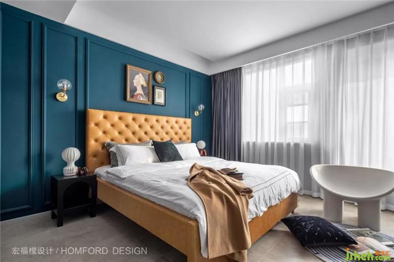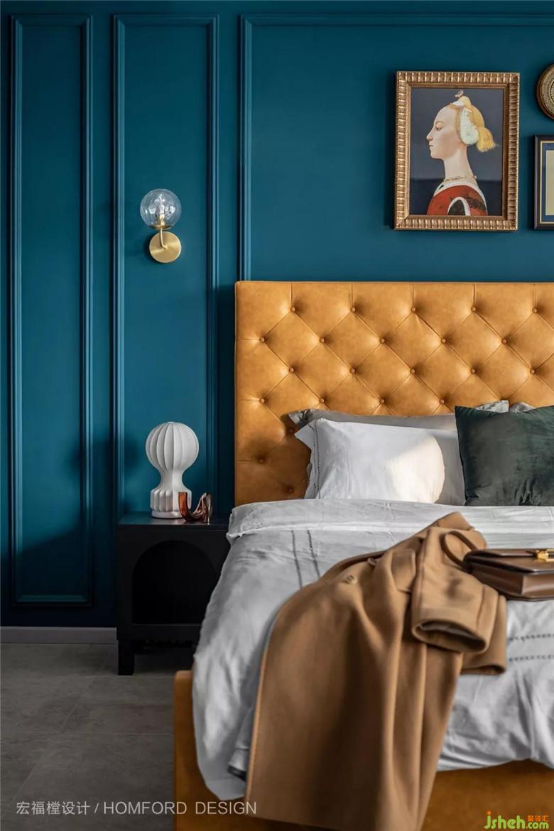 主臥室沿用客廳主調(diào)的孔雀藍(lán)同樣加上石膏線條組合、讓空間富有節(jié)奏感、 再搭配太妃糖色高靠背床體、營(yíng)造空間復(fù)古及高級(jí)感。