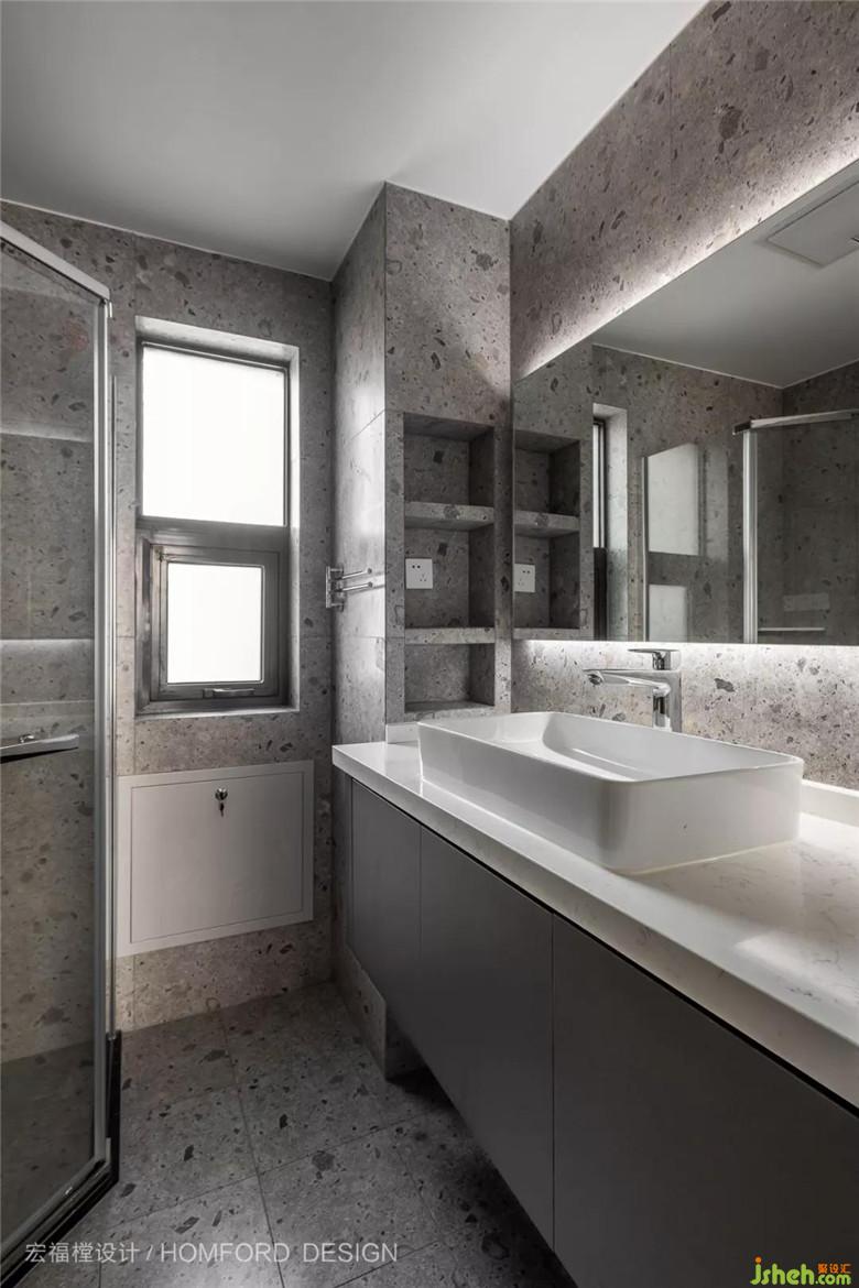而主要衛(wèi)生區(qū)域?yàn)槲葜鞔蛟斐鲎盍鲿吃缙鹚⒀绖?dòng)線,水磨石瓷磚搭配深灰柜體,時(shí)尚復(fù)古。我們希望賦予每一個(gè)空間,哪怕衛(wèi)生間也是一種視覺(jué)享受,迷人的生活美學(xué)就這樣一步步完成。