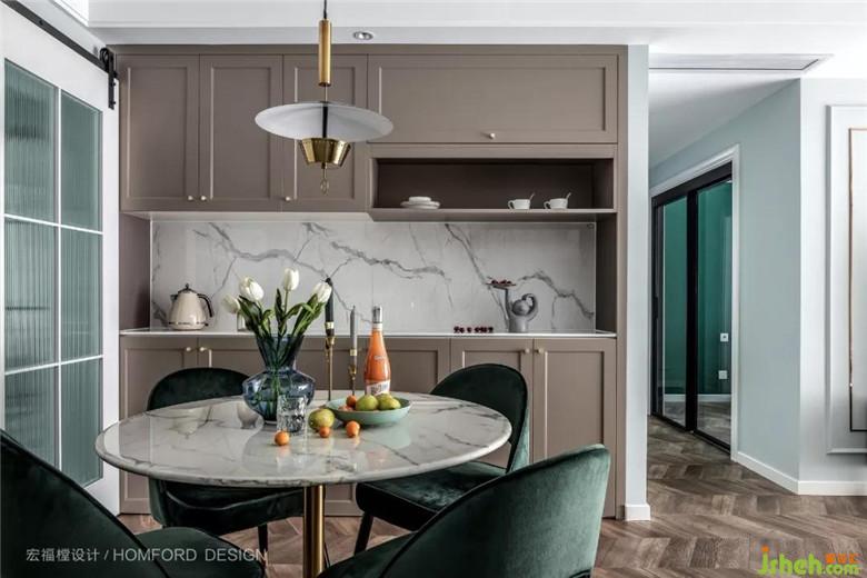 墨綠絲絨餐椅搭配簡(jiǎn)約金屬吊燈在與客廳氛圍相融合,也以輕奢感塑造了每天的用餐儀式感。