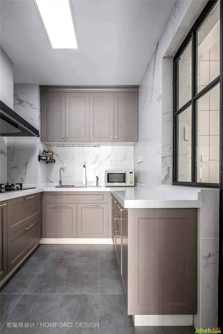 中廚與備餐臺(tái)相互融合呼應(yīng),灰咖色搭配大理石貼磚,身在倍感舒適與放松的空間里,做出的飯菜也必定可口美味。