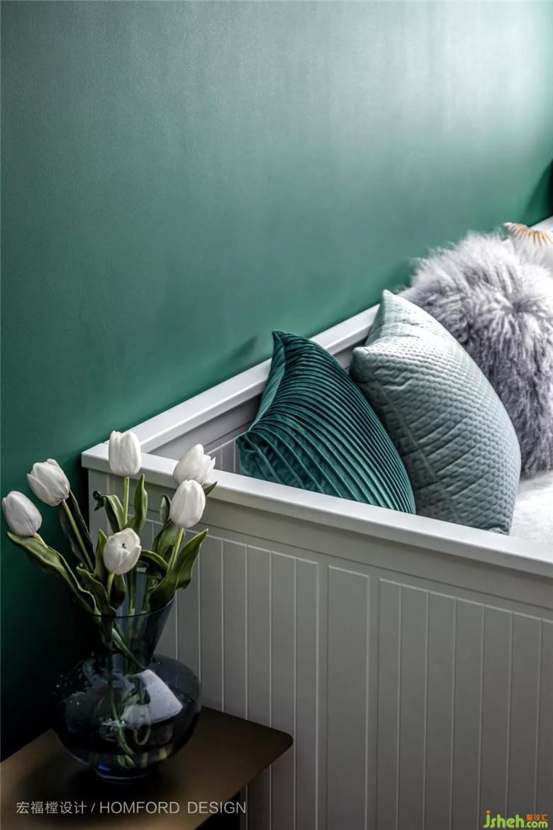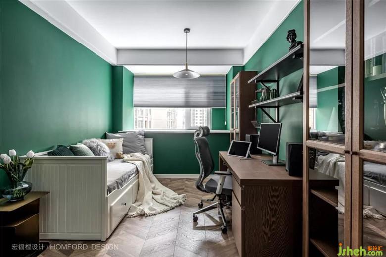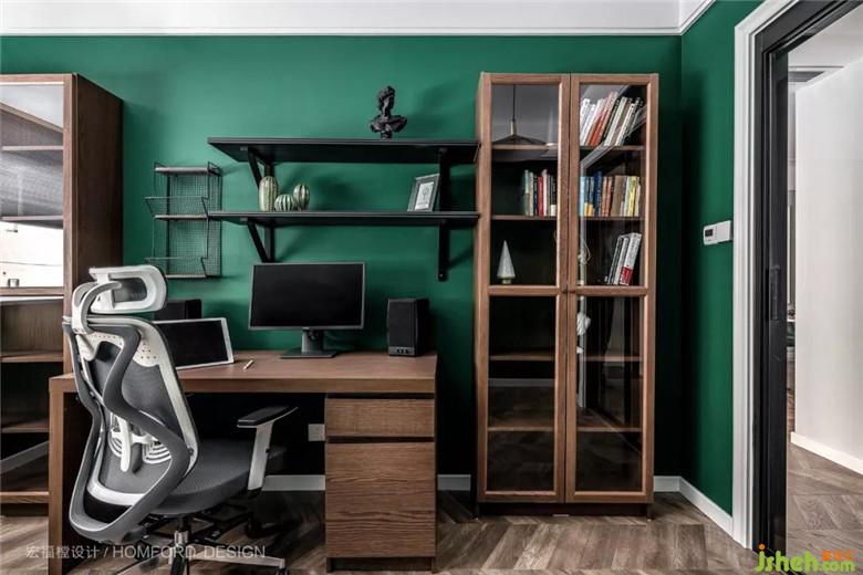 書(shū)房使用的大面積墨綠讓男屋主可以不受打擾的遨游在自己喜愛(ài)的色彩世界里,去掉金屬元素改用原木色書(shū)柜搭配也讓整個(gè)環(huán)境仿佛置身于清新的大自然中。