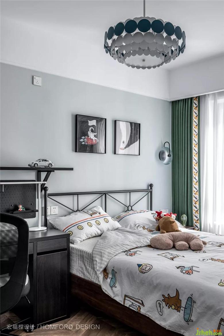 兒童房的搭配根據(jù)男屋主對(duì)自己五歲孩子成長(zhǎng)過(guò)程的想法而來(lái),太空人的掛畫(huà),黑色的鐵藝床,讓整個(gè)房間保留童趣又不失小男子漢的硬朗感。