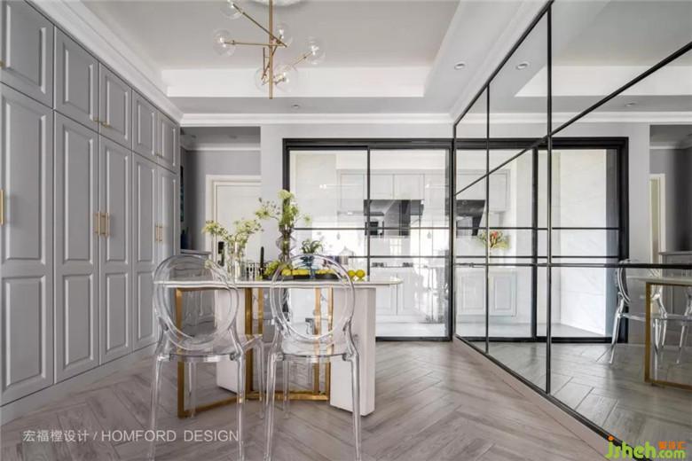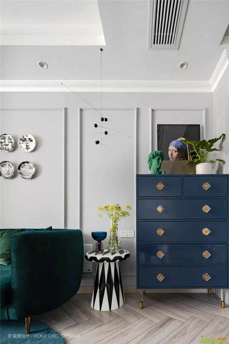 我們采用了大量的簡單線條結構,以高級灰為空間主色調(diào)搭配復古墨綠色。法式雕花元素的加入讓空間更具層次感。