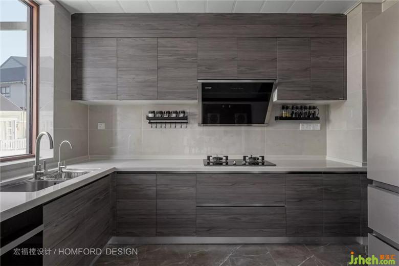 廚房與餐廳間僅玻璃吊敞門(mén)之隔,雙扇打開(kāi)后空間感很大氣,悠閑的時(shí)光里可充當(dāng)開(kāi)放式廚房使用,做飯之余可和家人溫暖互動(dòng)。
