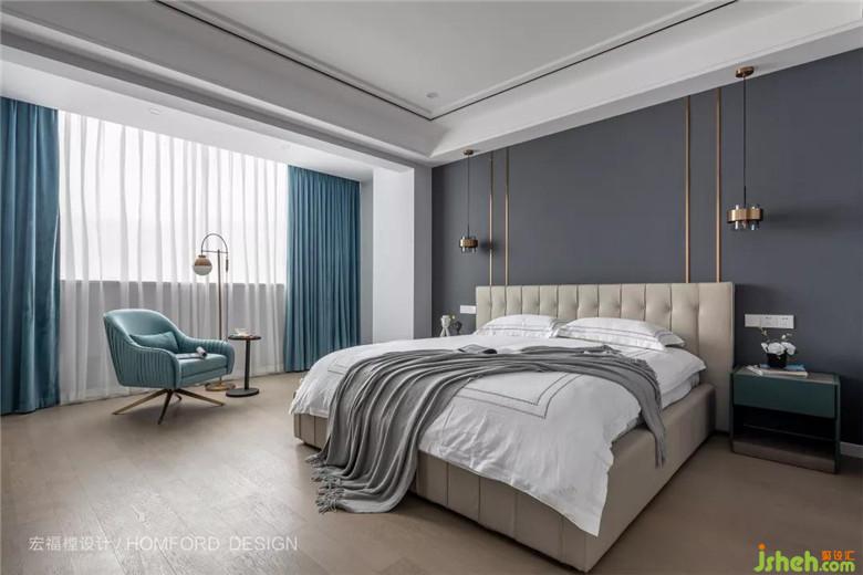 主臥面積寬敞,一整面窗戶(hù)帶來(lái)了極好的采光。整個(gè)空間色彩簡(jiǎn)約淡雅,穿插一些金屬元素避免了乏味。水藍(lán)色的窗簾與沙發(fā)讓空間更放松,增添了臥室中的舒適與愜意感。