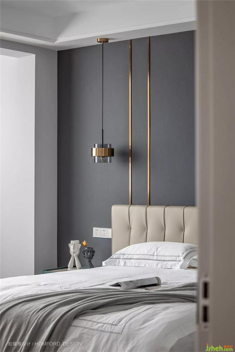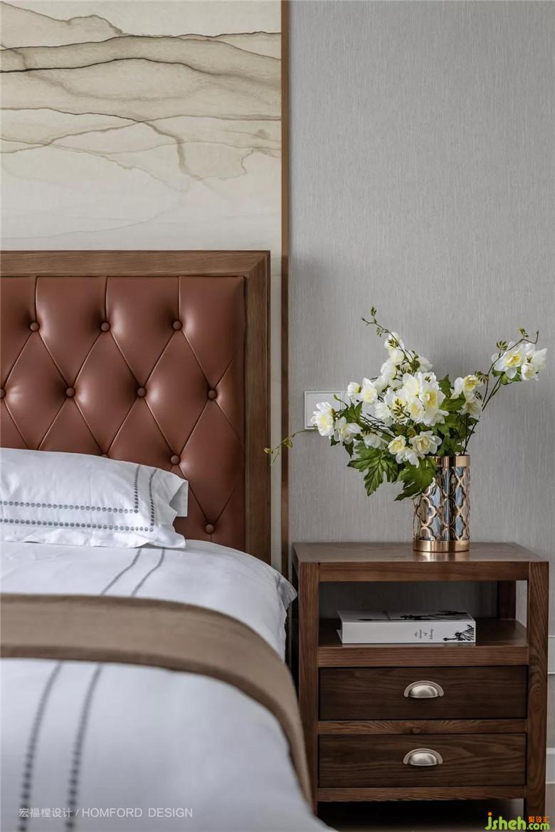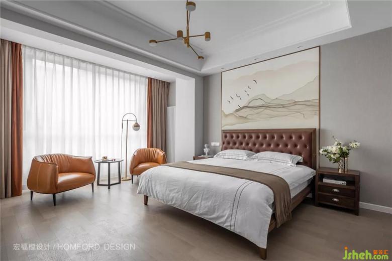 次臥雖為老人居住,但在風(fēng)格上不希望做的太傳統(tǒng)。于是選擇皮質(zhì)軟包床而又在墻上融入了一副中式畫(huà),傳統(tǒng)又不失現(xiàn)代感。