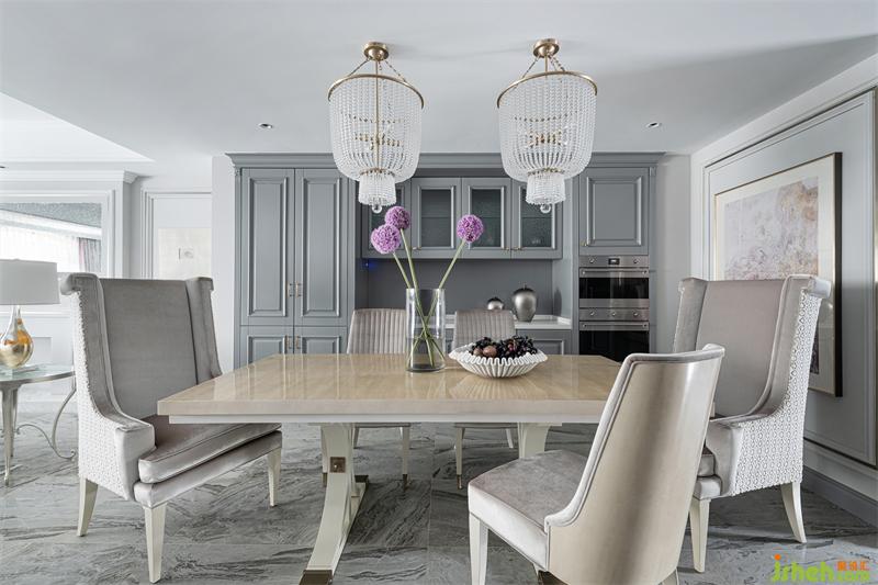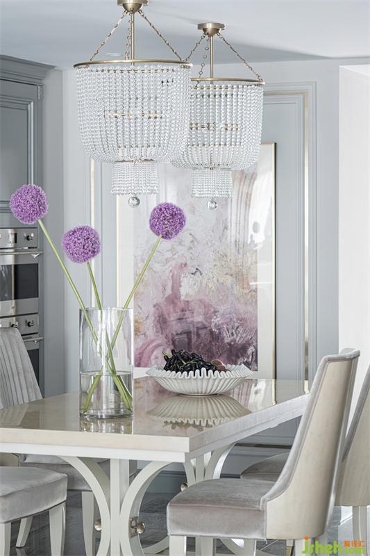 水晶吊燈與有弧度造型的餐椅賦予空間動態(tài)的韻律與美感,淡紫色金屬邊框掛畫散發(fā)出浪漫清新的氣息,準(zhǔn)確描摹出屋主的雅貴氣質(zhì)和平日里自在的生活狀態(tài)。