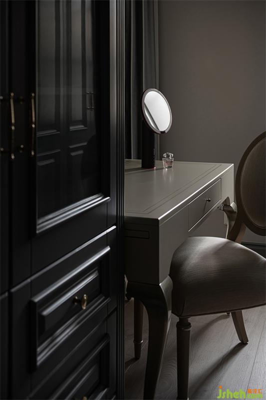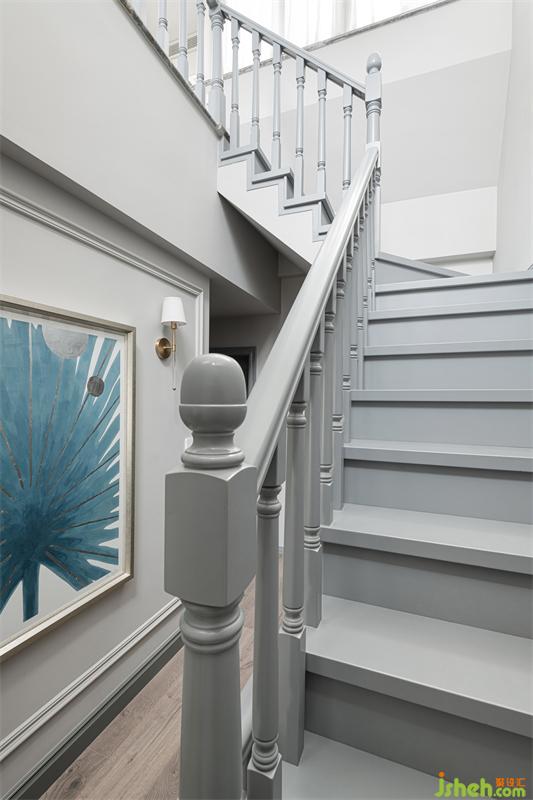 樓梯整體采用高級灰打底,墻面印象派畫作用以跳色,灰與藍的搭配充滿戲劇效果,一抹藍色躍然而出。線條在此空間被運用的淋漓盡致,墻面石膏線條、實木踢腳線、實木門框線、樓梯羅馬柱線條,每一個細節(jié)的處理與點綴,都是設計者對風格整體把控能力展現(xiàn)。