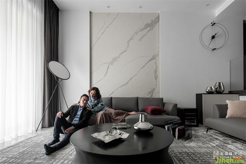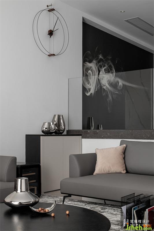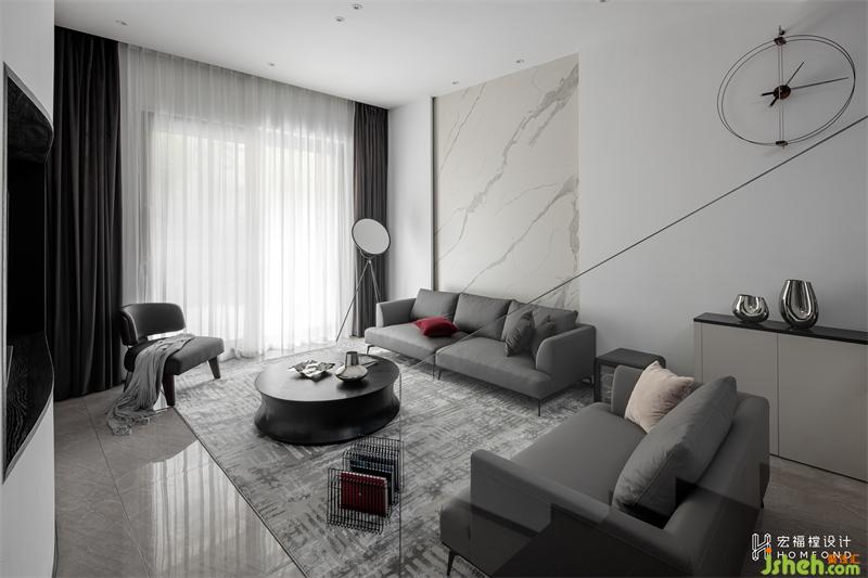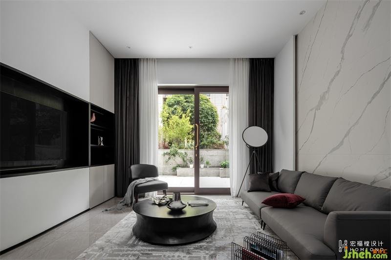 下躍式空間,從形式、幾何構(gòu)造等方面入手,改變了樓梯方向之后,墻面大面積留白,在視覺(jué)上擴(kuò)大空間感受。電視墻設(shè)計(jì)為弧形造型,從遠(yuǎn)至近,彎曲的墻壁改變了居住者入門(mén)后的直行動(dòng)線和對(duì)內(nèi)部空間的氛圍感知。拉開(kāi)窗簾,明凈通透的落地窗最大限度地呈現(xiàn)了室外的綠植風(fēng)景,優(yōu)雅且富有儀式感的日常生活在此徐徐展開(kāi)。