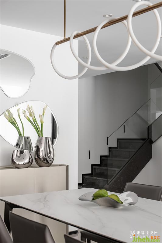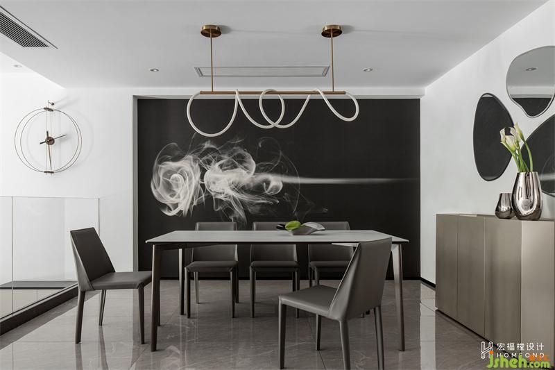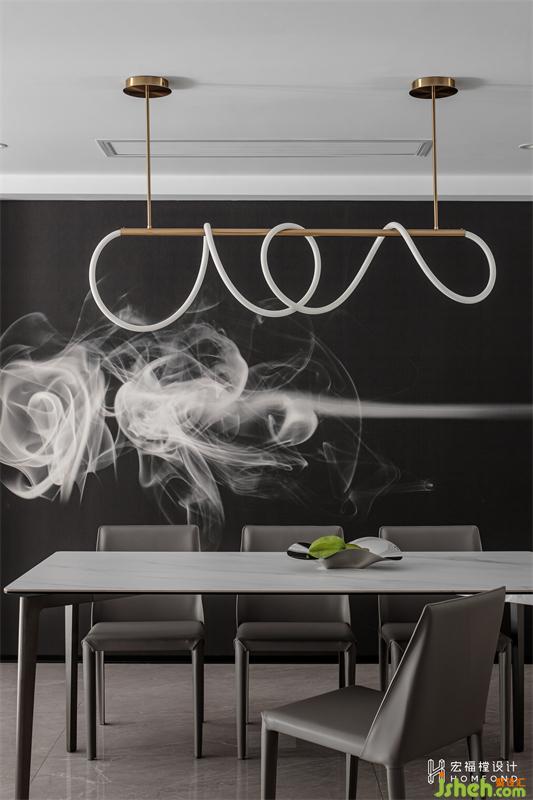 打破極簡(jiǎn)通常會(huì)給人帶來(lái)的沉悶感,利用簡(jiǎn)潔線條、動(dòng)感線性吊燈、富有藝術(shù)氣息的餐廳背景墻共同烘托出現(xiàn)代摩登的都市氛圍。