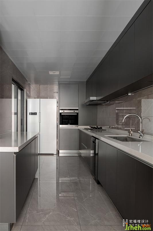 生活陽(yáng)臺(tái)與廚房合并,擴(kuò)大使用范圍,左右兩側(cè)是5210mm、2723mm的櫥柜區(qū)域,超大的儲(chǔ)存容量讓廚房時(shí)刻保持干凈整潔。最后,往后方搭建9.3m2的生活陽(yáng)臺(tái)區(qū)域。采用玻璃推拉門(mén)隔斷,流通的空間采光極佳。