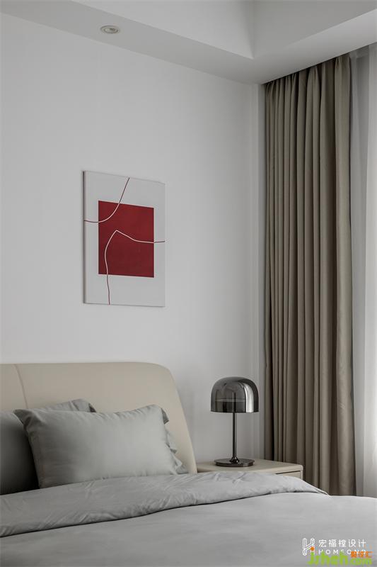 一樓次臥為親朋好友臨時(shí)居住空間,緊挨入門(mén)花園,自然光線十分充足。首先,亮白與柔和的米色系營(yíng)造舒適溫馨的氣氛,然后加入紅色掛畫(huà),使整體空間更富有現(xiàn)代藝術(shù)質(zhì)感。