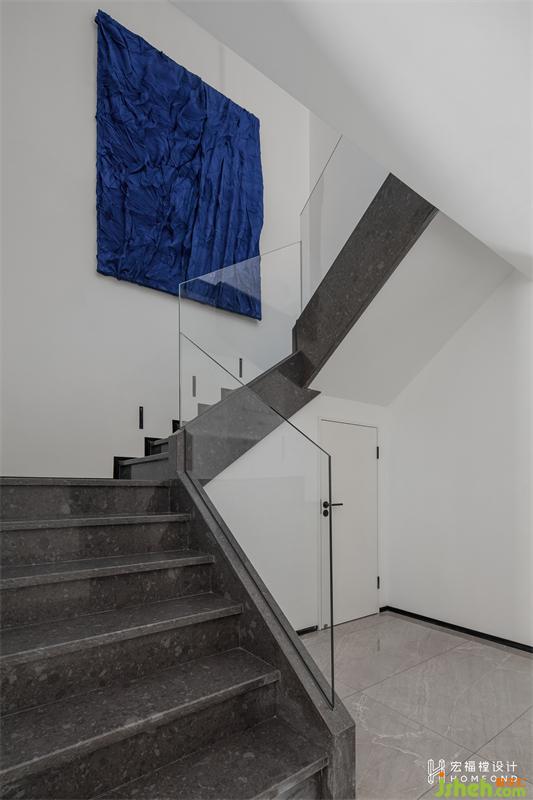 樓梯以玻璃與大理石材質(zhì)呈現(xiàn),自然色調(diào)搭配女屋主親手制作的米克諾斯藍(lán)掛畫(huà),陽(yáng)剛與柔美進(jìn)行調(diào)和,感受浪漫與深邃。