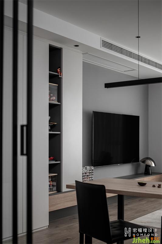 滿足正常儲(chǔ)物需求后,電視墻從左至右以一種遞減視覺壓抑感的方式呈現(xiàn),儲(chǔ)物柜與展示柜占據(jù)墻面2375mm,其余2890mm留白。