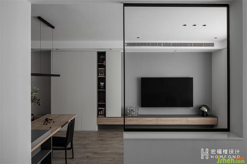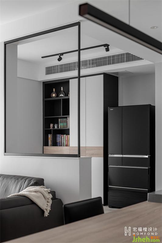 書房改造為開放式,并將客廳的墻面破開寬1300mx高1100mm面積,延伸空間視覺,擴(kuò)大公共區(qū)域面積。打破傳統(tǒng)設(shè)計(jì)理念,選擇鏤空,利用極窄邊框進(jìn)行框景,讓空間、人與人之間,更具交互感。因屋主的生活習(xí)慣是較少使用廚房,并將水及零食存放于冰箱,所以我們將其放置在外,生活動(dòng)線更為方便。