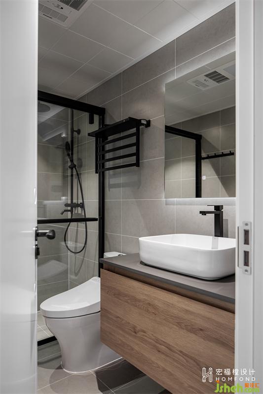 衛(wèi)生間使用啞光系列的材質(zhì)來(lái)表達(dá)空間質(zhì)感,龍頭、毛巾架、花灑選擇黑色銅質(zhì),和浴室柜門(mén)淳樸的木質(zhì)原色形成很好的契合度。