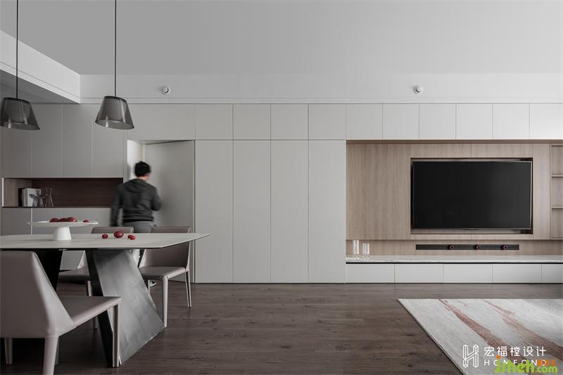 在辦公環(huán)境多元化的時(shí)代,其實(shí)生活習(xí)慣也在慢慢發(fā)生著改變。將原始電視墻與沙發(fā)墻位置調(diào)換,改變主臥、書房一側(cè)的生活動(dòng)線,利用總長(zhǎng)9575mm的柜體,將玄關(guān)、電視墻聯(lián)為一面,而將書房、主臥藏于其中,賦予空間更多的趣味意義。