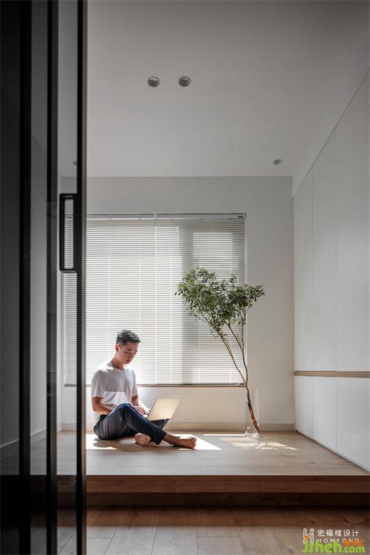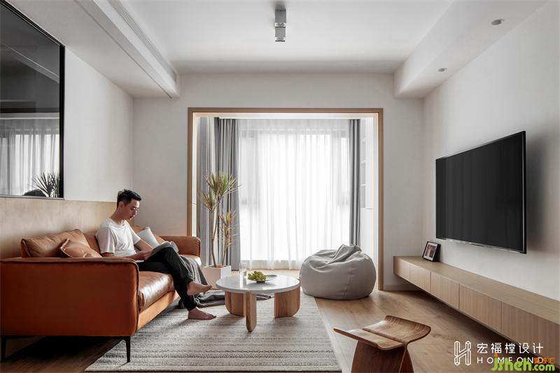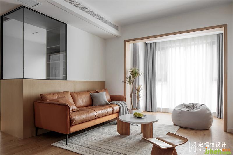 朝北的空間光線會(huì)受到影響,所以陽(yáng)臺(tái)納入客廳一并使用,并將緊鄰的隔墻與房門進(jìn)行拆除,打破局限的原始空間感,設(shè)計(jì)為簡(jiǎn)潔有力的玻璃立面,讓更多的光線照射進(jìn)來。