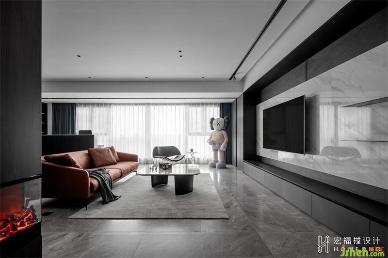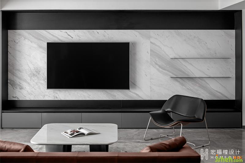 整體采用柔光云灰色地磚進行鋪貼,讓公共區(qū)域簡潔有力的同時更有高級感。4690mm長度的電視墻拉伸了整個空間的橫向感,大理石材質(zhì)與黑色護墻板進行疊層搭配,用基礎(chǔ)的線面組合釋放無限的空間思維,在視野上延伸寬度與深邃感,底部的收納柜放置屋主未開封的手辦使用。