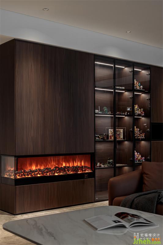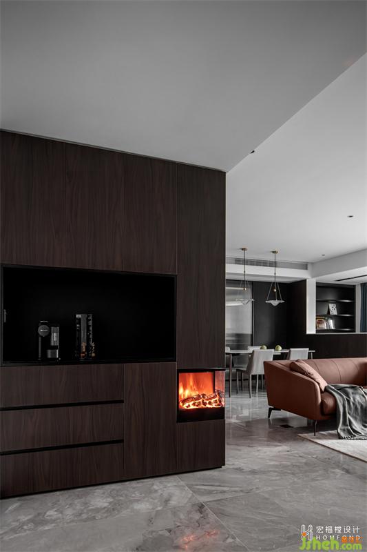 定制的電子仿真壁爐,除中和冷調(diào),讓居家氛圍更溫馨外,還有風口為空間輸送暖氣。L型柜體挨著走廊的方向我們將其中間位置設(shè)計為1200mmx600mmx400mm(長、寬、深度)的開放式儲物形式,可放置屋主購買的家用咖啡機及一些常用水杯,下方則是抽屜柜,用于放置咖啡粉、果汁等食品類生活物品,使用起來非常方便。