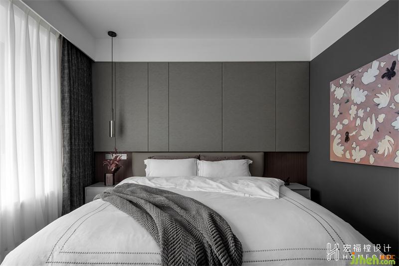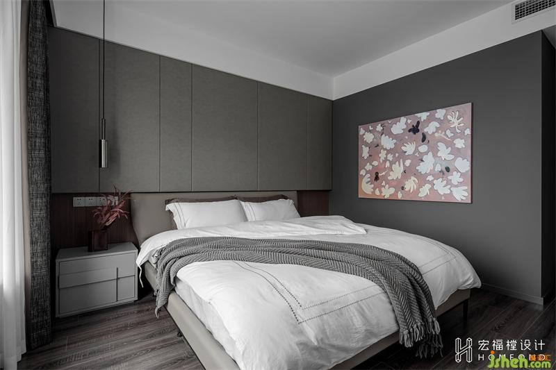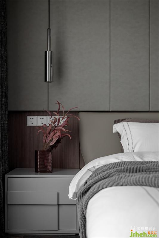主臥由于收納空間不足,所以調(diào)整了衛(wèi)生間與臥室之間的距離,設(shè)計為1820mmx1670mm的L型衣帽間。整體風格去掉過于硬朗的黑色,延續(xù)灰調(diào),搭配柔和的粉色,氛圍兼具優(yōu)雅與浪漫,打造別樣夢境。