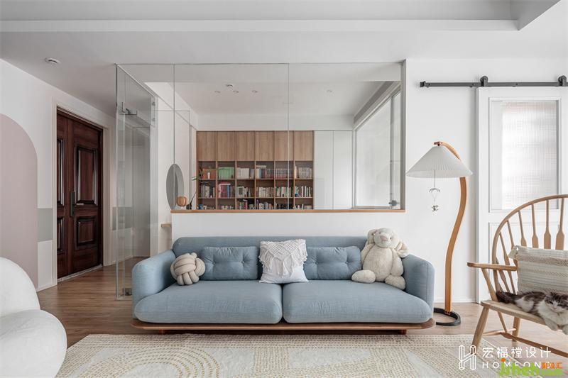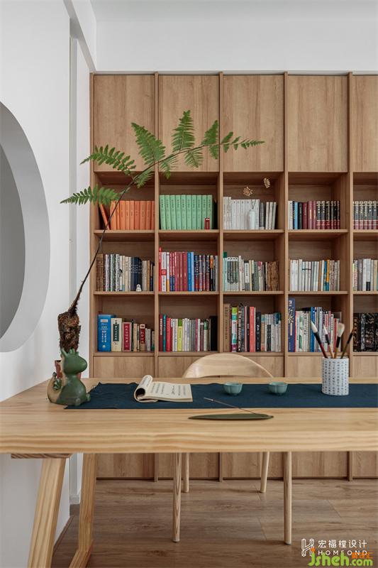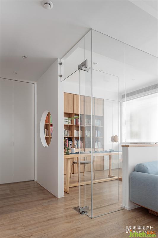 二人平日里喜愛閱讀,所以定制了一面2800mm長度的書柜墻。女主人給每一格空間都做了清晰的分類,中國古詩詞、世界名著、現(xiàn)代小說、人物傳記、藝術(shù)畫冊(cè)以及夫妻倆的專業(yè)書籍等等,呈現(xiàn)出舒適美感的同時(shí)又方便檢索。在滿足書房功能后,給予了一部分空間給相鄰的貓舍使用,同樣以玻璃材質(zhì)進(jìn)行區(qū)域分隔,流通的光線在視覺上似分而連。