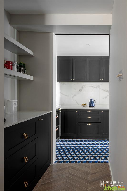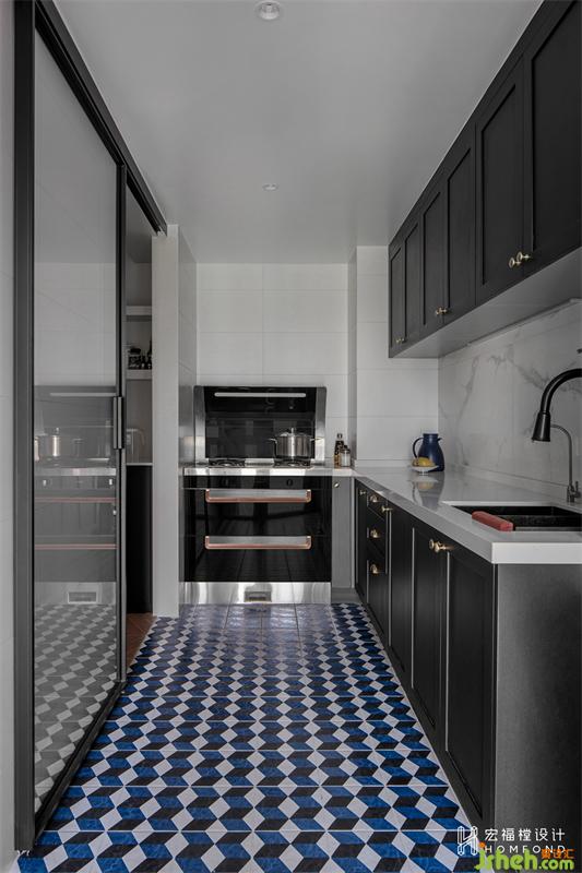 屋主的初衷是希望廚房全開放,但因為家里有養(yǎng)貓,且它偶爾會去廚房偷吃,所以我們在交界處安裝了一扇非常靈活的玻璃推拉滑動門。內(nèi)部空間全部打通,視野通透開闊,令人心情舒暢。區(qū)別與外部空間,使用了米克諾斯藍(lán)幾何圖案地磚,風(fēng)韻更甚,并帶來視覺上的樂趣。