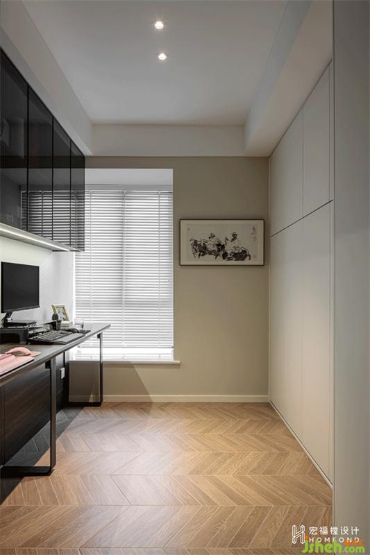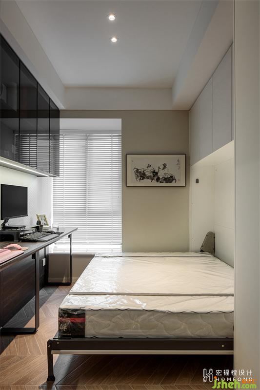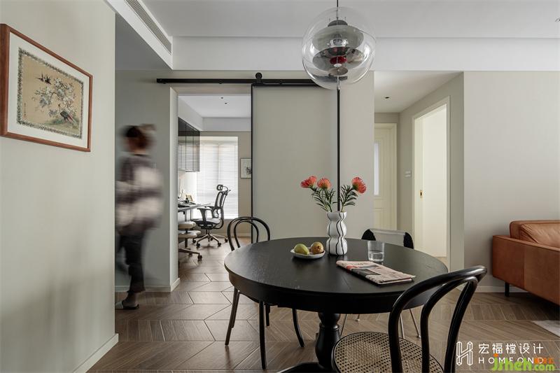 空間里每一個轉(zhuǎn)角框景及色彩、質(zhì)感帶來的美學(xué)反應(yīng),同時也發(fā)揮著它的實用作用。設(shè)計師抓住了令空間更具開放感的竅門,并把書房的自然光線引入餐廳空間。在收納上,我們設(shè)計了長度為3070mm的儲物空間,2050mm長度放置墨菲床,有客人探訪時可充當(dāng)次臥使用,平時活動空間則完全不受影響,讓書房的功能性倍增。