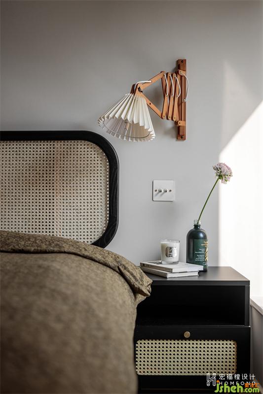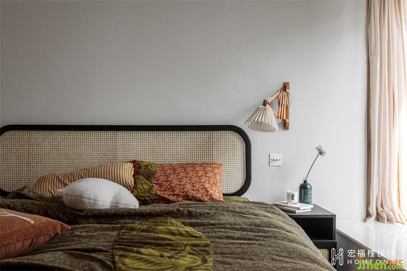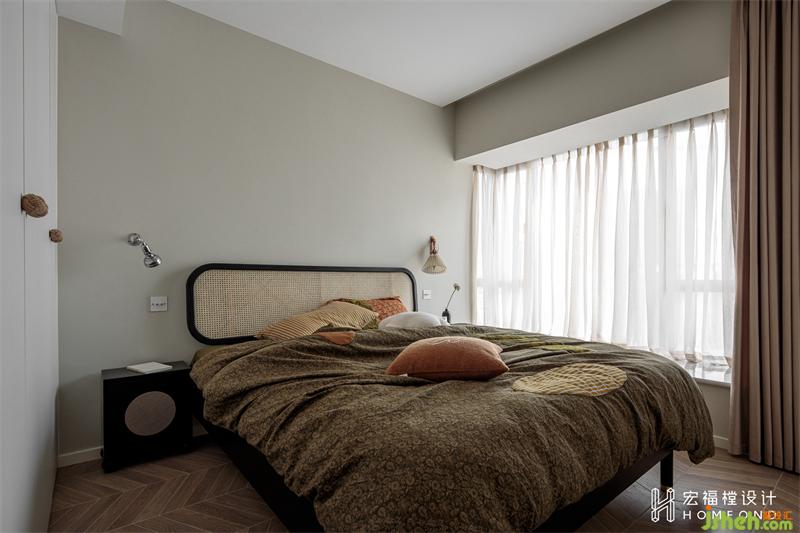 原始主臥局促,移動墻體,借用了外部220mm寬度后,得以實現(xiàn)儲物空間位置。為了營造舒適且有廣度的空間,房間以低飽和度的自然色系營造清新溫柔的氛圍。再以低矮的家具構(gòu)成布局,并只簡單的放置了他們喜歡的小件物品。