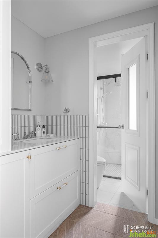 移動墻體后,將衛(wèi)生間區(qū)域改造為獨立的干濕兩個區(qū)域。根據(jù)女屋主的化妝習(xí)慣,在洗手臺左側(cè)為她設(shè)計了五格收納空間。家居設(shè)計整體以亮白色調(diào)呈現(xiàn),用不同材質(zhì)來劃分層次,最后加入金屬優(yōu)化細(xì)節(jié)。這一設(shè)計也在視覺上延伸了空間的寬敞感。