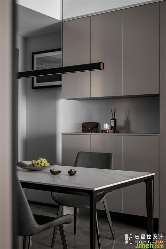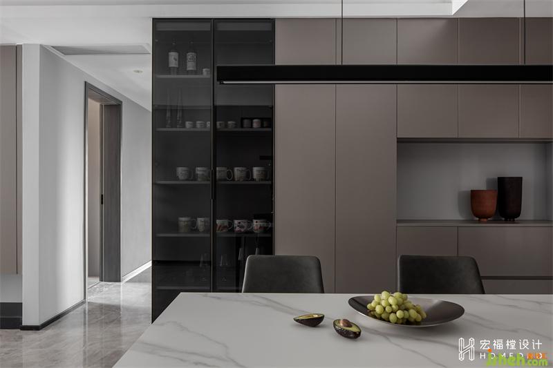 家居設(shè)計利用中廚延伸出來的350mm設(shè)計餐廳區(qū)域柜體,深色玻璃展示區(qū)+餐廚雜物儲物區(qū)。屋主兩人常年都會去各地旅游,并熱衷于收集當(dāng)?shù)氐鸟R克杯,整個展示柜承載的是他們滿滿的美好回憶和走遍世界的收獲。