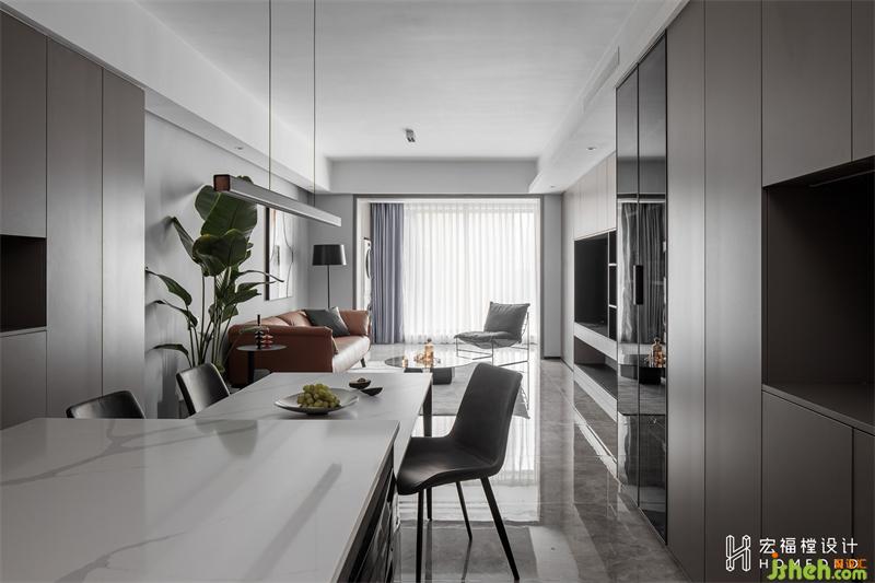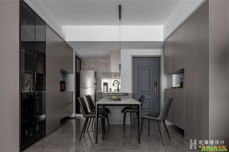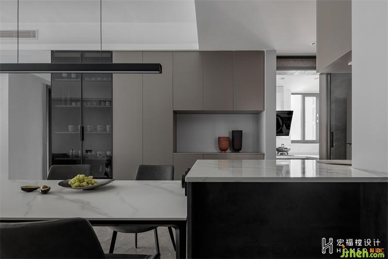 原本餐廳面積較小,加上玄關(guān)鞋柜2130mmx350mm位置,空間更為吃緊。所以將原始廚房墻體進(jìn)行拆除,并合并臨近的生活陽臺空間,劃分為中西廚兩部分。開放式西廚則與餐廳島臺連為一體,既減少了使用面積,也完全符合屋主較西式的用餐習(xí)慣。
