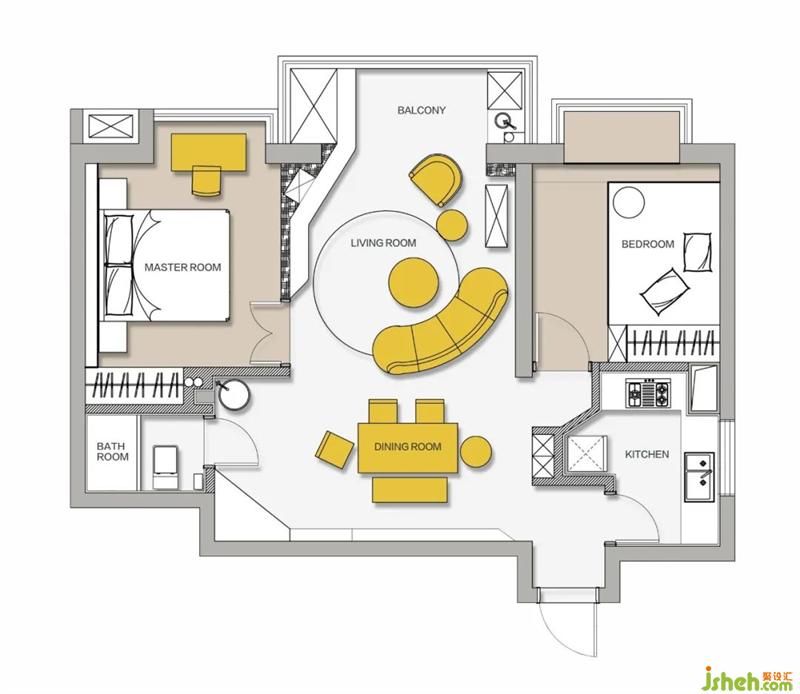 ? 借次臥少許面積與入戶走廊合并改造為玄關(guān),增加儲物的同時(shí)利用凸處擴(kuò)大廚房面積,放置冰箱