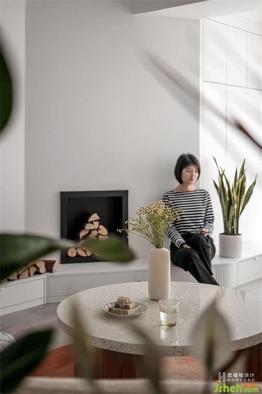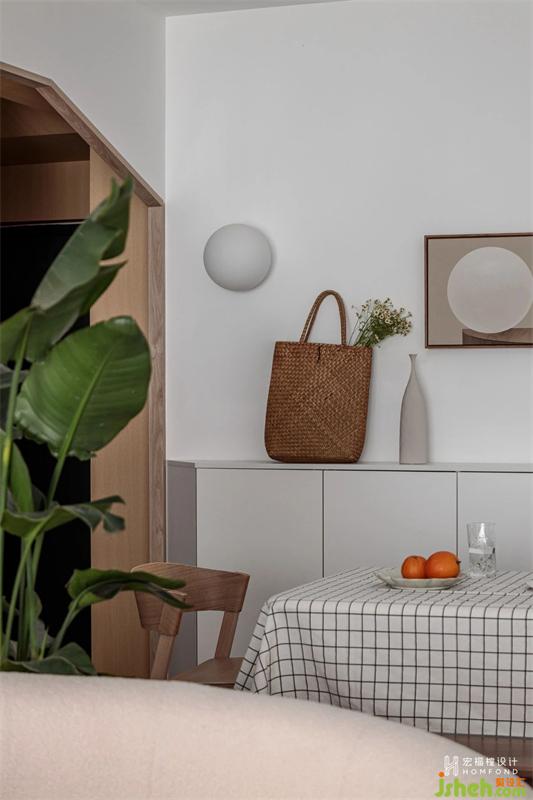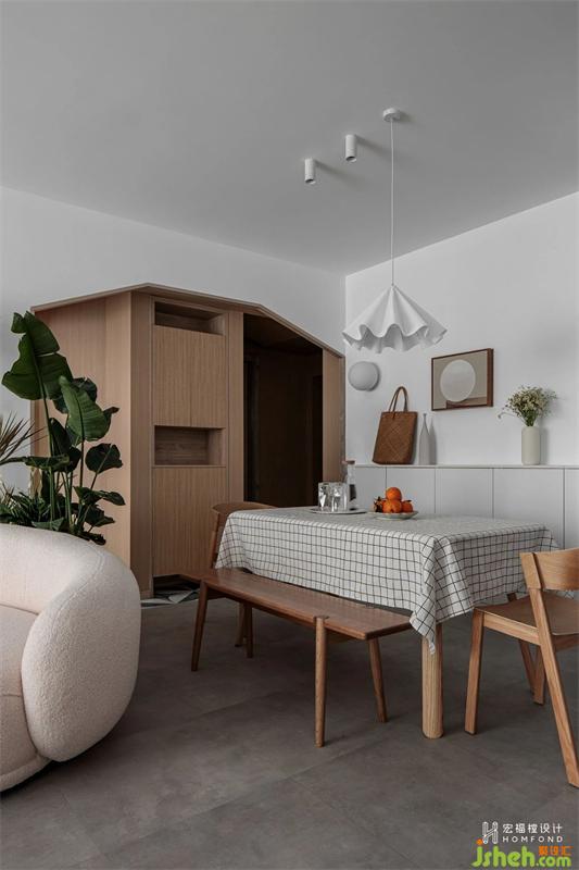 在滿足兩間臥室的實(shí)用和隱私性之后,打破客餐廳常態(tài)布局,呈現(xiàn)出靈活別致的有趣動線。以白鷺色為空間整體基調(diào),室內(nèi)材質(zhì)使用擁有溫潤屬性的天然木材、棉麻織物,適當(dāng)加入綠植,讓居住者在細(xì)膩而樸素的色系中,找尋到日常生活里最舒適、愜意的狀態(tài)。