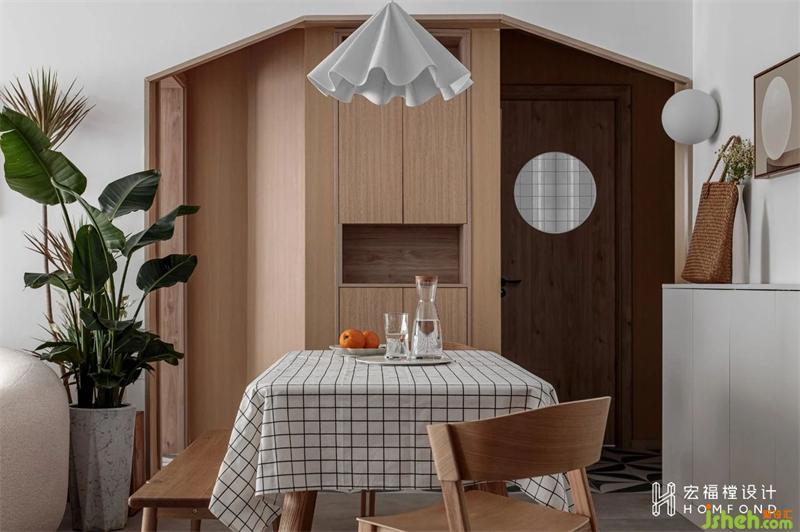 在有限的尺度下,順勢而為,利用原戶型硬傷部分(入戶無遮擋,餐廳面積不合理等),加入儲物功能并將其塑造為幾何形態(tài),打造出空間的趣味性和亮點(diǎn)。
