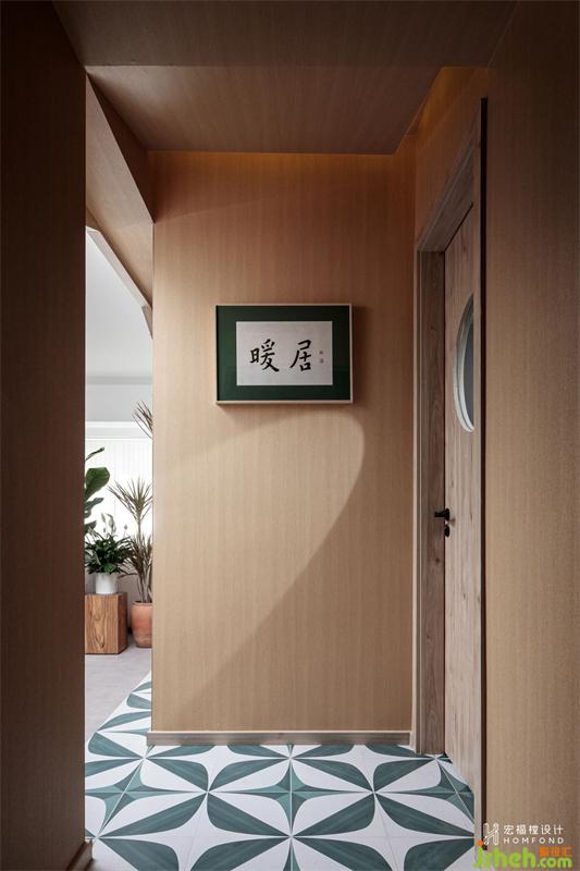 利用原始入戶空間設(shè)計(jì)一處R型遮擋玄關(guān),并利用戶頂橫梁改造為斜面坡頂,營造出戶外木屋的自然氛圍感。在響應(yīng)日常鞋類存儲的使用需求的同時(shí)又賞心悅目,獨(dú)特的墨綠星空花磚成功將居住者從繁雜庸擾的外部世界引入“暖居”。