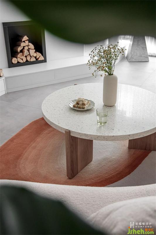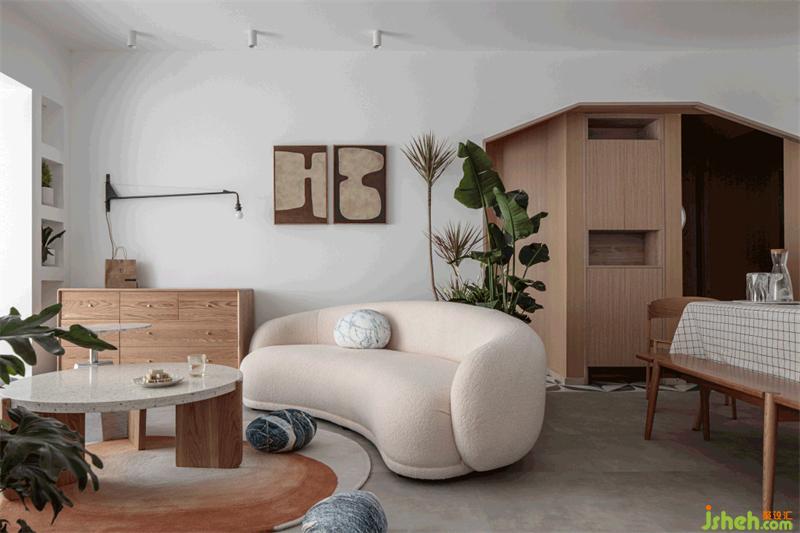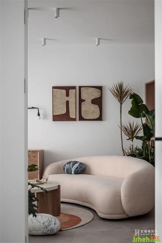 不同于傳統(tǒng)的客廳陳設(shè)形式,沙發(fā)具有圓潤的線條感,立體飽滿,靠客廳邊緣位置斜放,與環(huán)繞客廳的綠植剛好成為一處端景。留出的空間部分恰好與玄關(guān)、餐廳、陽臺動線形成有趣靈活的互動關(guān)系。