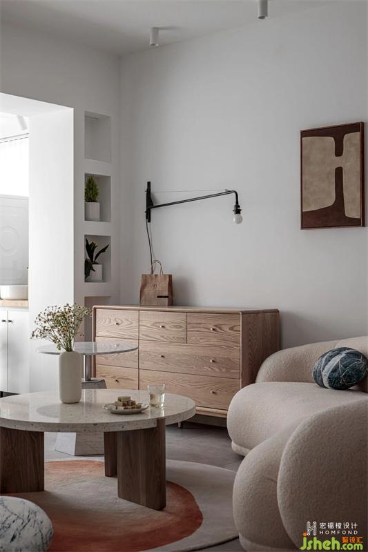 成都家居設(shè)計用流線型造型替代常規(guī)直線墻體,為屋主打造獨一無二的斜面幕布觀影方式,儲物與造型互相滲透結(jié)合,花一分錢得兩分效果。