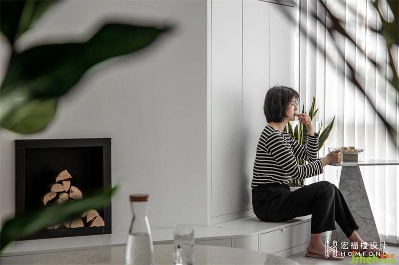 納入客廳的陽臺也保留住了原始功能,利用豎百葉將自然光線柔和、過濾后再引入室內(nèi)。在地臺柜旁放置小邊幾,不論晴天或陰雨天,品上一杯清茶,吃上一塊糕點,心情便會隨之搖曳游動。