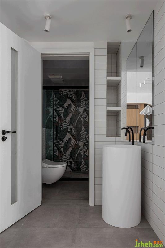 原始衛(wèi)生間面積無法滿足生活需求,我們將其進行干濕分區(qū),外部墻側(cè)位置設(shè)計為干區(qū),與餐廳空間融合,生活動線更顯便捷。內(nèi)部應(yīng)景玄關(guān)樹屋造型,利用極具自然意味的花磚提升空間氛圍,靈動且不泛濫。