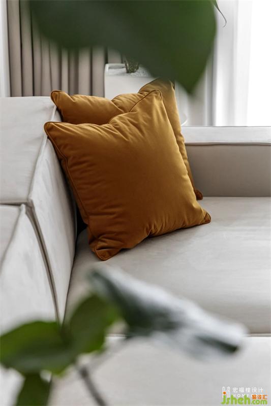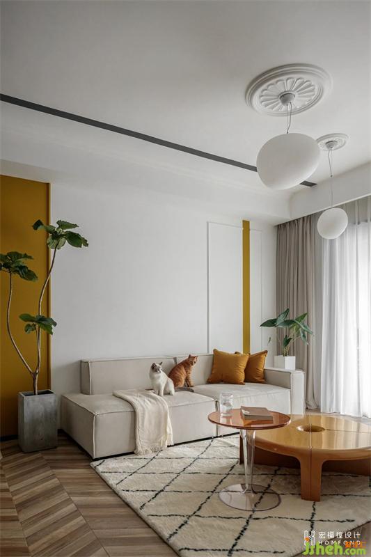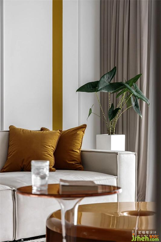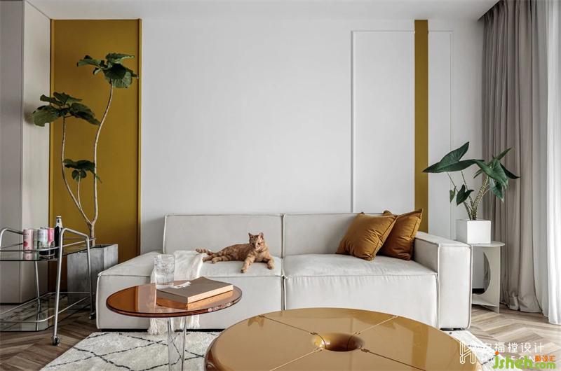 左框以分割設計手法來強調墻面存在感,右框以傳統(tǒng)歐式石膏線作為分割,再以線作為串聯(lián)。芥末黃作為背景色進行填充,沙發(fā)、邊幾則無需過多的裝飾便可以達到高級而藝術的效果。燒橙色亞克力咖啡桌的加入,客廳空間獲得了完美的對比度。